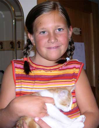 Ich hatte einmal eine Katze, sie war weiß und rotbraungetigert. Meine Mutter wollte auf keinen Fall eine Katze haben - wegen der Arbeit: sie arbeitet im Residence und meinte, eine Katze würde in die Betten der Gäste gehen. Als wir vom Meer zurückkamen, brachte uns meine Oma aber ganz überraschend eine Katze. Ich nannte sie gleich Mizi. Oma hat erzählt, dass meine Tante Tania sie zu ihr gebracht hatte. Tania war bei einer Freundin und auf einmal kam eine kleine Katze und Tania nahm sie mit. Die Katze kam schon tagelang zur Freundin und sie fürchtete sich. Ich hatte eine riesengroße Freude, als meine Oma die Katze brachte. Wir riefen gleich meine Tante Dagmar an. Sie hatte die ganzen Sachen für eine Katze, weil sie früher auch eine Katze hatte. Die war aber leider gestorben. So baten wir sie, ob sie uns die Sachen leihen könnte. |