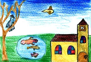 Da hackten sich die Zimmerleute in einem fort ins Fleisch, und Vögel trugen die blutigen Späne höher auf den Berg hinauf. Wo sie die Späne fallen ließen, wurde dann die gegenwärtige Pfarrkirche gebaut. JULIA RUNGGALDIER |