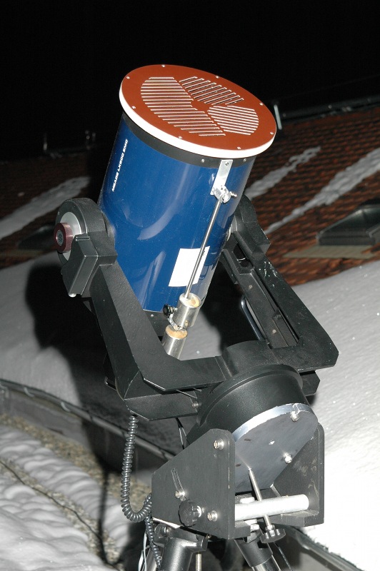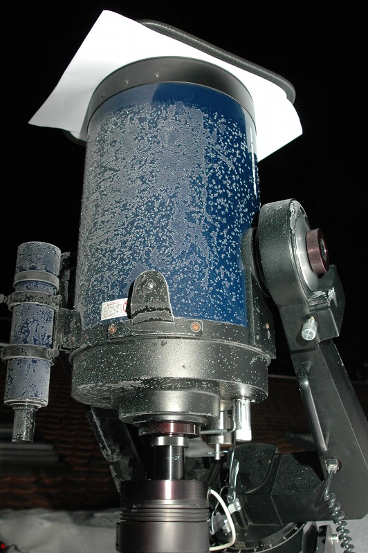 Das Teleskop im eisigen Einsatz. Man sieht hinten die CCD-Kamera am Teleskop. Die Taukappe ist an einem Streifen eisfrei - dort heizen wir mit stromdurchflossenem Konstantandraht.