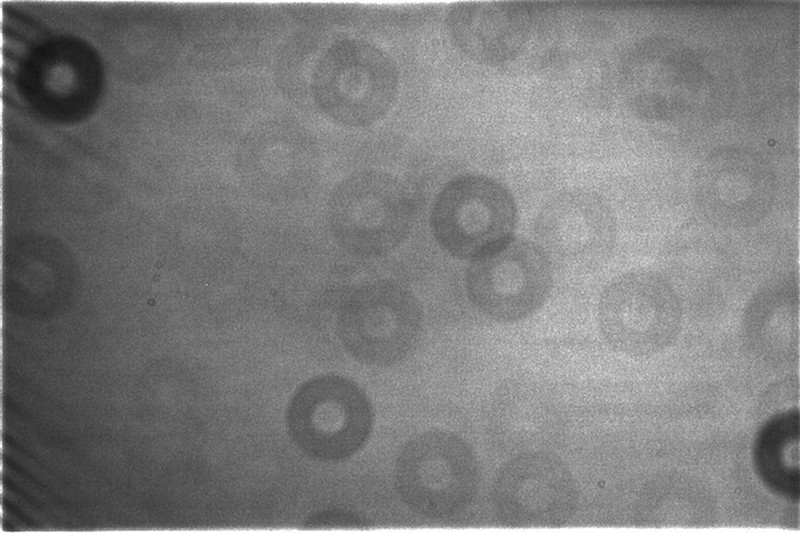 Ein Beispiel für eine Flatfieldaufnahme. Das dunkle Muster aus "Dust-Donuts" kommt von Staubteilchen, welche auf dem Eingangsfenster der CCD-Kamera sitzen. Diese werden unscharf auf dem Chip abgebildet und reduzieren selektiv die Empfindlichkeit. Genau diesen Effekt versuchen wir mit solchen Aufnahmen auszugleichen. Die viel kleineren Kringel sind Staubkörner, welche direkt auf dem Chip sitzen. Das Streifenmuster am linken Rand ist uns ein Rätsel. Wer hier Antworten weiß, möge sich bitte melden!