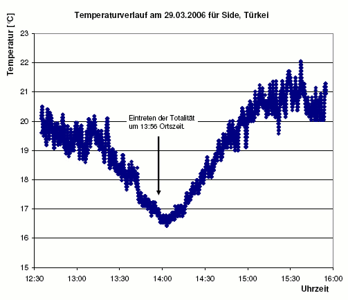 Das ehemalige Piratennest Side stand am 29. März auf dem Programm. Dort wurden wir Zeugen eines einzigartigen Schauspiels: einer totalen Sonnenfinsternis. Das Erlebte in Worte zu fassen fällt schwer... Unsere stets leuchtende Sonne verlor zuerst langsam, dann immer schneller an Kraft. Die Ruinen zwischen den Sanddünen von Side wurden in silbernes, fast unnatürliches Licht getaucht. Die Spannung unter den Anwesenden wurde fast mit Händen greifbar uns steigerte sich in den letzten Augenblicken vor der totalen Phase zu Euphorie. Und dann geschieht es: Der letzte gleißende Punkt schmilzt zusammen und verlischt. Ein dunkler Schatten legt sich über die Landschaft und plötzlich wird alles leise. Am Himmel strahlt die majestätische Korona in ihrem weißen fahlen Licht - die Welt steht still.