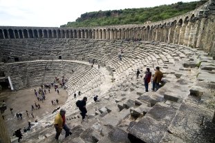 Im Hinterland, grün und üppig so weit das Auge reicht, befinden sich unzählige Relikte aus der Zeit der Hethiter, Griechen und Römer wie eines der besterhaltendsten Theater der Antike: das Theater von Aspendos, das einst der ganze Stolz der römischen Provinz Pamphilien war. Der Anblick dieses imposanten Theaters war faszinierend, doch die meisten von uns waren von der Ruinenstadt Termessos noch beeindruckter. Diese schwer zugänglichen Ruinen liegen auf einem Gebirgspass auf 1000 m Seehöhe. Unvergesslich ist der Blick von den Stufen des gut erhaltenen Theaters hinab in die umliegenden Täler oder das Schlendern zwischen den zig Sarkophagen der Nekropole. Nicht umsonst heißt es im Reiseführer: "Wenn Ruinen atemberaubend sein können, dann die von Termessos." Auch der Besuch der Düden-Wasserfälle mit anschließendem Forellenschmaus soll nicht unerwähnt bleiben. Durch ein Netz von Felskavernen hatten wir die Gelegenheit, die Wasserfälle auch von der Rückseite zu sehen.