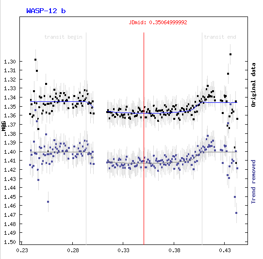 Wie schon im letzten Schuljahr wollten wir auch nach dieser CY-Aquarii-Saison wieder einen Transitplaneten aufs Korn nehmen. Die Nacht des 30.12.12 schien gute Voraussetzungen zu bieten und der Stern Wasp-12 sollte einen zeitlich günstig gelegenen Transit seines Planeten Wasp-12b zeigen. Der Helligkeitseinbruch war in der selben Größenordnung wie der von Wasp-33 beim letzten Mal, nÄmlich 15 mmag. Allerdings war diesmal das Muttergestirn mit einer scheinbaren Helligkeit von nur 11.7 mag deutlich schwÄcher.