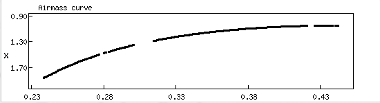 Diese Kurve zeigt den Verlauf der sog. "airmass", also der Dicke der Luftsäule, durch die wir im Verlauf der Beobachtung beobachten mussten. Im Zenit ist die Airmass per Definition gleich Eins.